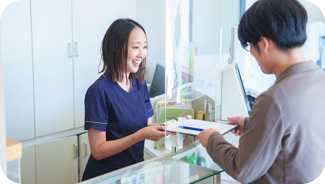 来院された患者さまを笑顔でお迎えし、治療への不安を少しでも和らげることが受付の大切な役割です。会計や予約管理などの事務業務に加え、スタッフや患者さまとの橋渡し役として、まさき歯科全体を支えます。